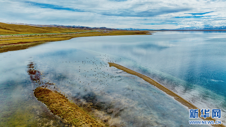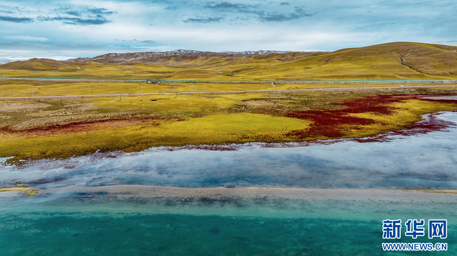 秋日清晨,位于有“千湖之县”之称的青海省果洛藏族自治州玛多县境内的冬格措纳湖湖水湛蓝、天空辽阔,湖畔草地绿黄交融,静美迷人。
