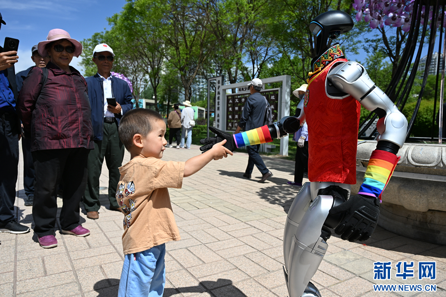 一名小朋友与人形机器人握手。