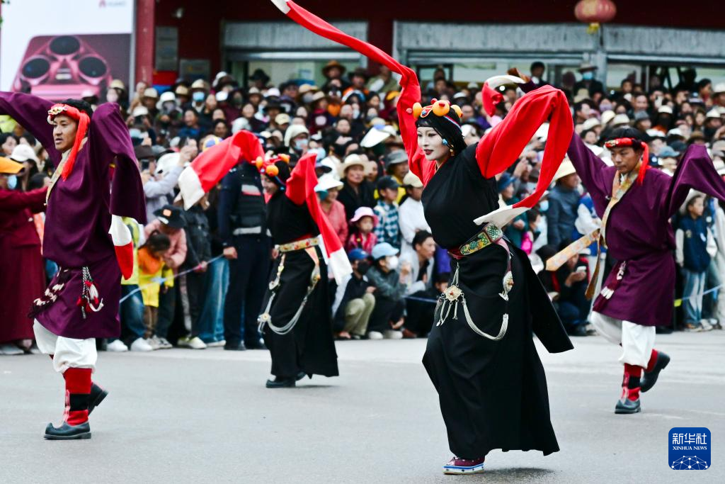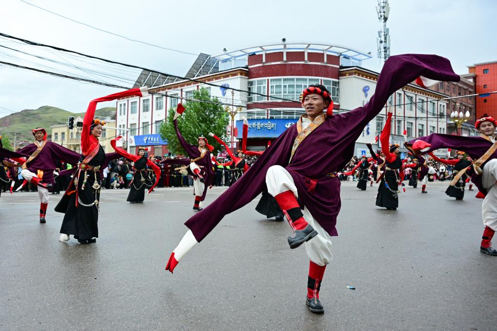 8月20日,在青海省玉树藏族自治州囊谦县,演员在欢迎巡游中表演。新华社记者 齐芷玥 摄
