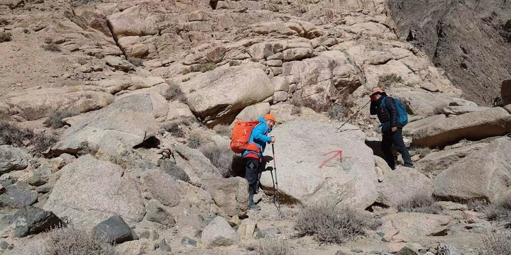 邓李才和田才让拿着地形图、拄着登山杖,沿着山脊和沟壑向上爬。一边探路,一边用喷漆做标记。