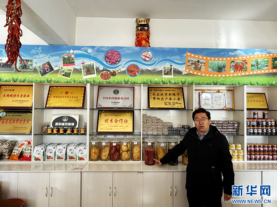 红柳村第一书记桓国平介绍特色农产品。新华网 鱼昊 摄