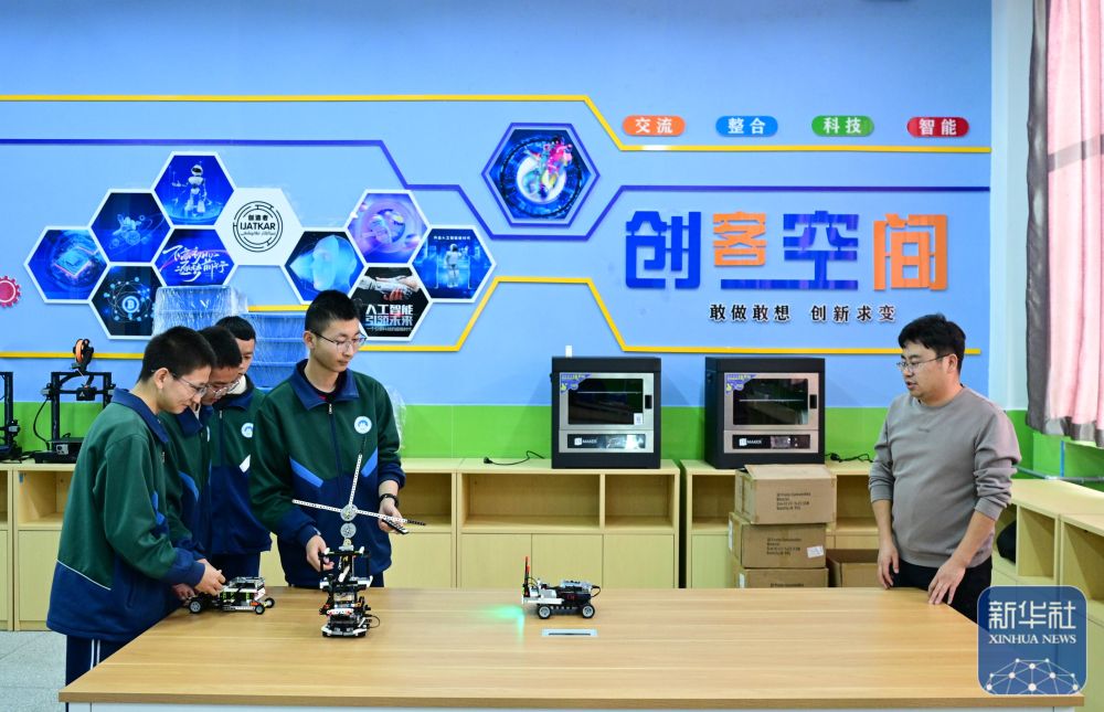 12月24日,在青海省海北藏族自治州门源回族自治县浩门镇高级中学创客空间社团教室,老师(右)在指导学生。