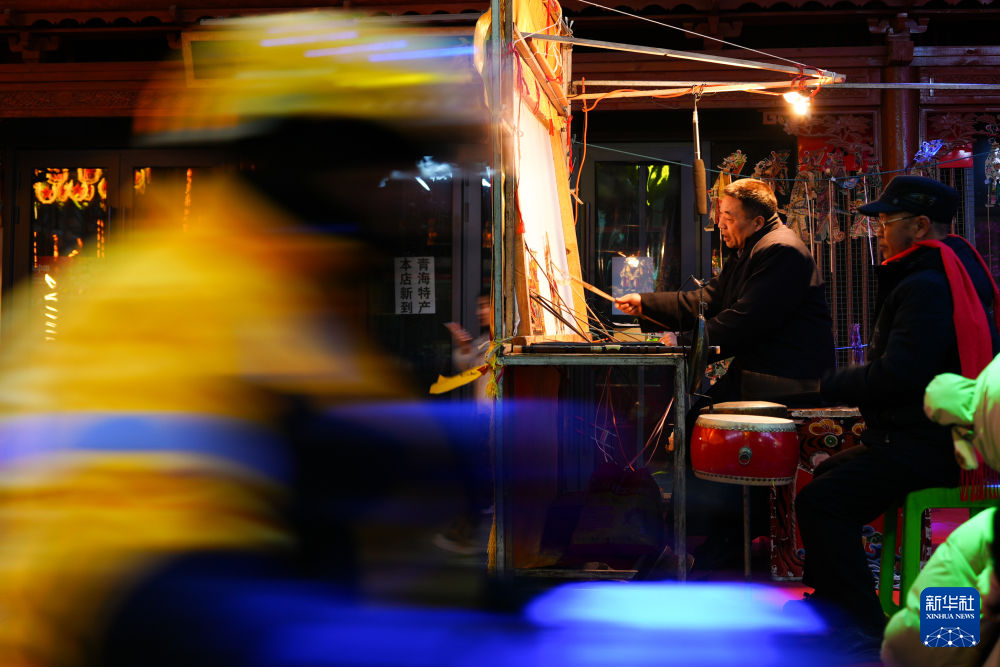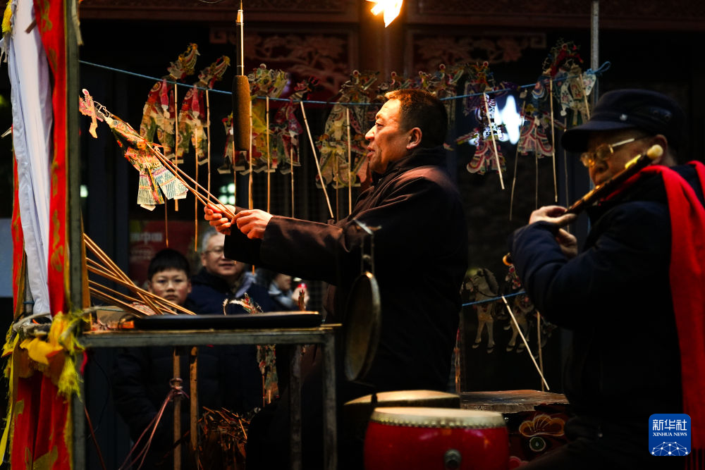 1月25日,周邦辉(右二)在青海省西宁市城北区表演皮影戏。新华社记者 齐芷玥 摄