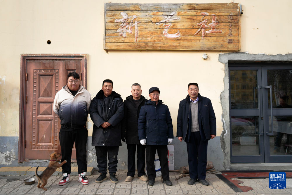 1月25日,在青海省西宁市大通回族土族自治县东柳村,新艺皮影社成员周德鹏、刘成玉、雷吉林、靳永义、周邦辉(从左至右)在出发前合影。新华社记者 齐芷玥 摄