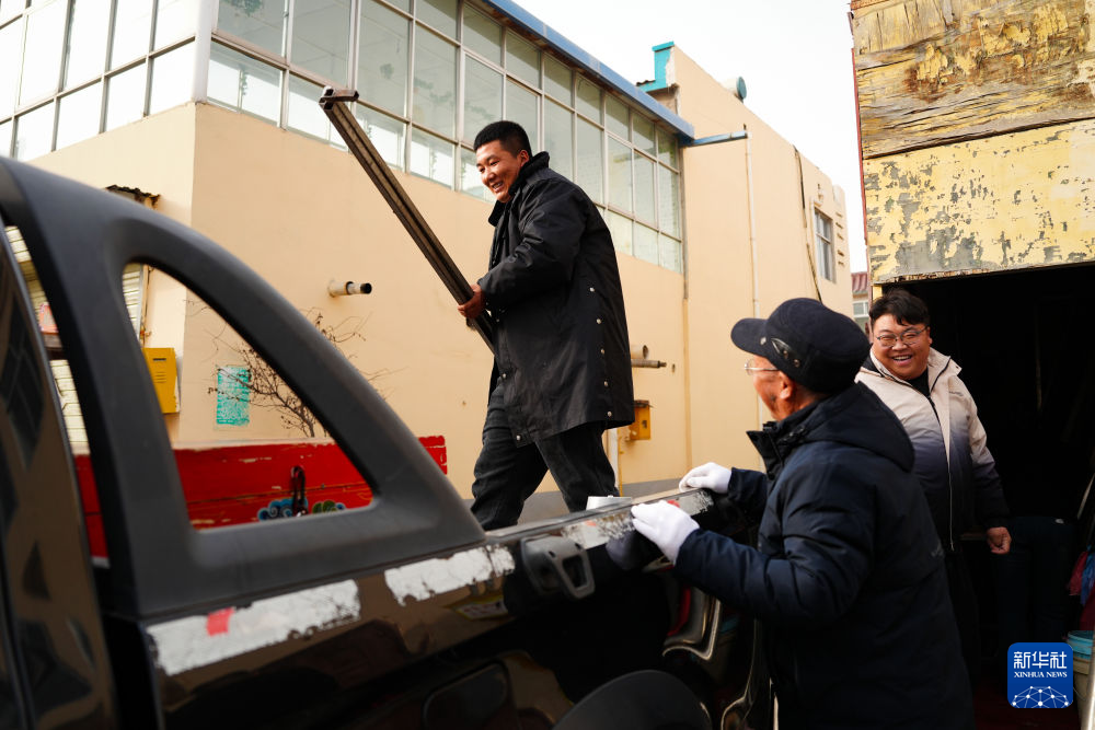 1月25日,新艺皮影社的成员刘成玉(左)、靳永义(中)与周德鹏将演出所用的道具和戏台架装车。新华社记者 齐芷玥 摄