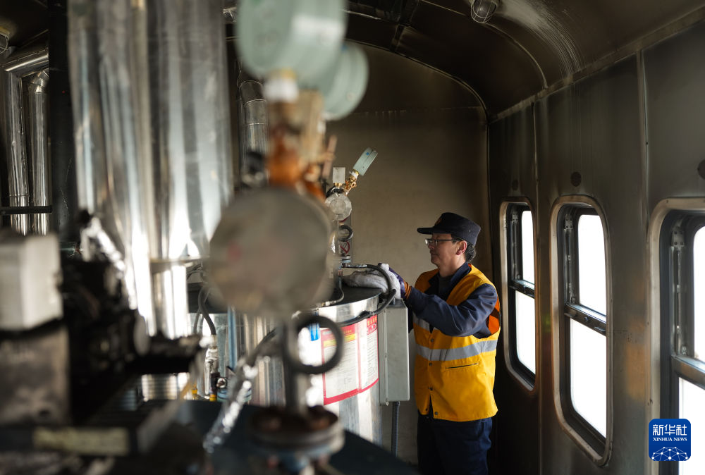 2月5日,韩景泉在列车上巡检设备。新华社记者 齐芷玥 摄